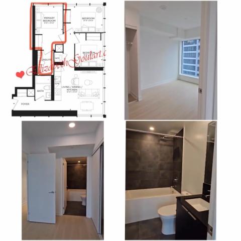 Wellesley駅から徒歩1分の便利なロケーションにある新築コンドのマスタールーム(専用バス付き)です。家具付き(ダブルベッド、机、椅子、収納など)で、すぐに生活を始められます。