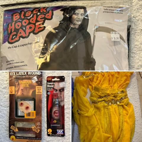 1, 黒のケープ (斧は付いて来ません) $10 一度試着しました。2, 血のりと吸血鬼に噛まれた跡 セットで$5 未開封