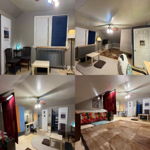 Bright large bedroom on 2nd floor with basic funiture (single bed, desk, closet, chair, lights, drawers, etc. )for rent。Convenient location 3 min bus ride from Pape Station (15 min walk) or Broadview Station.