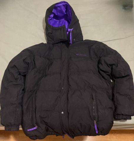 コロンビアの冬用ダウンジャケット。3年前に日本で購入しました。このダウンジャケットの右肩が少し白くなっています。白くなった原因は化粧品が少し付着したためです。もしクリーニングを行えばかなりキレイになるかと思います。使用していたため、値段を下げています。コロンビアのダウンジャケットでは珍しい紫色のデザインです。購入金額は税込で約36000円程度でした。