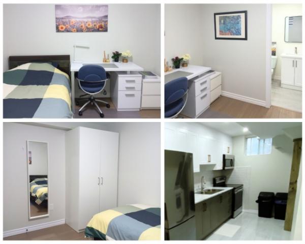 It is a furnished basement room including bed, closet, desk, utilities, private bathroom (en-suite), shared kitchen with appliances, and laundry machine and dryer.