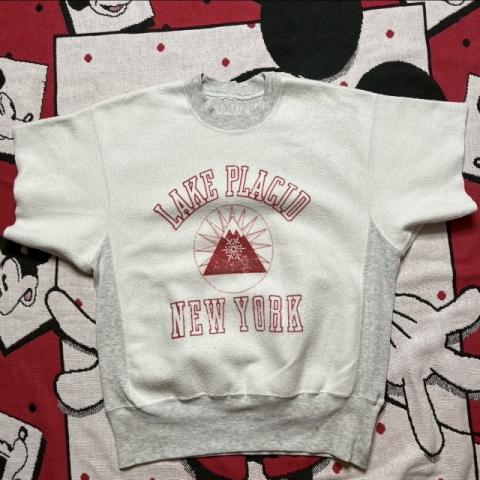 $20 リバースウィーブタイプスウェット裏地にプリントがされているような珍しいものかと思います。袖がカットされてるのでロンTと重ね着してもかわいいです。