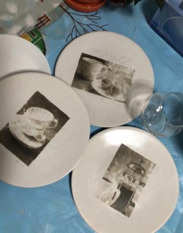They feature different coffee-themed images. One plate has a gold trim. They measure approximately 10 inches in diameter