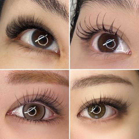 写真右上はボリュームラッシュフルセット、右下はラッシュリフト、左上はハイブリッドミディアムセット、左下はシングルラッシュフルセットです。