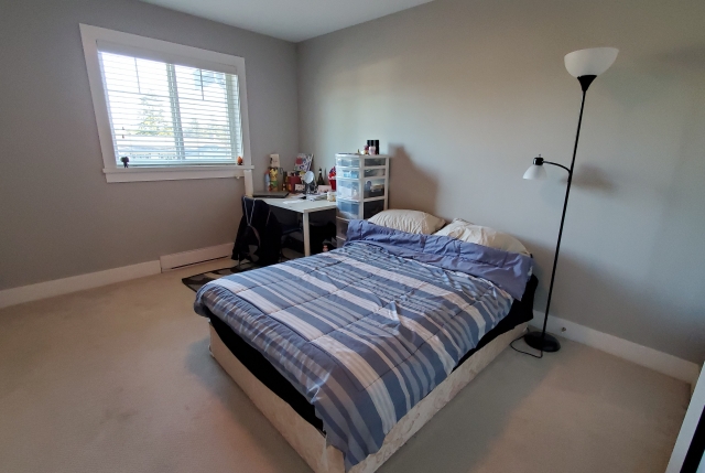 The room is furnished: double size bed, desk, chair, built-in closet.
