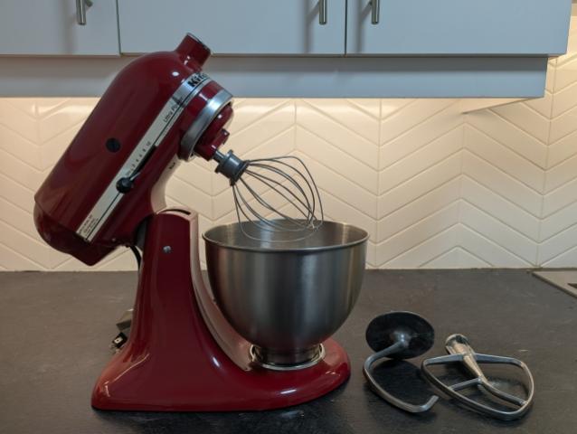 新品を購入して、数回しか使用していないので、とても綺麗な状態です。箱あり。説明書だけ少し汚れています。kitchen aid のパンを捏ねるフックで餅つきできます。サイズは4.3リットルです。