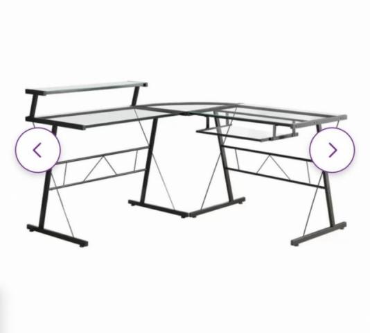 This L-shaped computer desk features a sleek glass top and a black metal frame. It includes multiple shelves for storage. The modern design provides ample workspace for your computer and accessories.