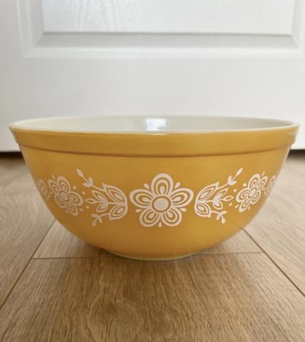 パイレックスミルクグラスバタフライゴールドのボウルを40ドルでお譲りします。