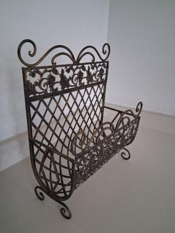 アンティーク マガジンラックブロンズ調の仕上げが施された、精巧な格子模様と植物のモチーフが特徴のアイアン製マガジンラックです