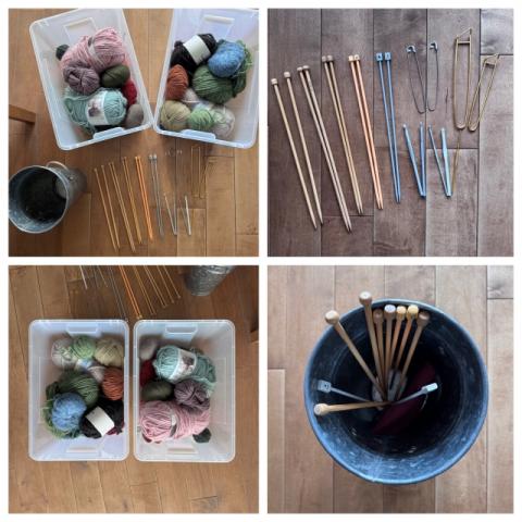 編み棒・編み針・毛糸・ステッチホルダーなどを縦長のメタルバケツに入れたセット、5ドルです。(実際にこうやって保管していました)含まれるものは下記をご覧ください。ー 木の編み棒・15