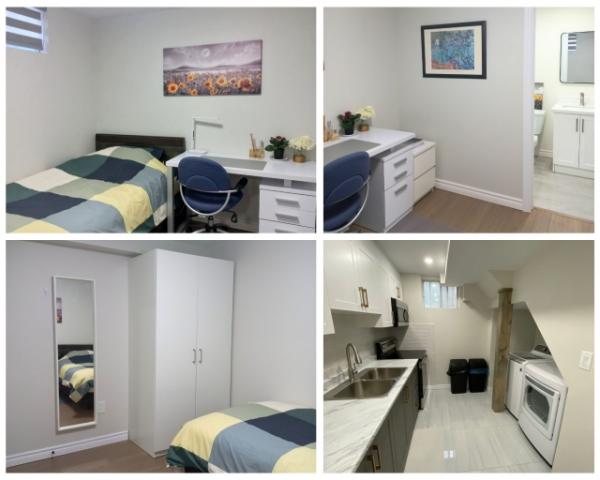 It is a furnished basement room with a private bathroom (en-suite) including bed, closet, desk, utilities, shared kitchen with appliances, and laundry machine and dryer.