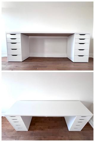 IKEA ALEX引き出しが両側に置き、その上に天板をのせたデスクをお譲りします。ALEXの引き出しは上段2つが低めの引き出し、下段3つが少し深めの引き出しになっています。天板の長さは2mと長いので書類などを広げて作業する場合にも便利です。現金またはe-transfer