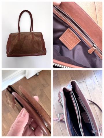 コーチの茶色のレザートートバックです。内側真ん中にファスナーのついた大きなポケットがあり、それが仕切りになって両側に荷物が入れられるようになっています。片側にPCを片側に細々したものを、財布などの貴重品は真ん中のファスナーがあるポケットにとわけて入れることができるのでとても便利です。お仕事用にも使いやすいバックです。現金またはe-transfer