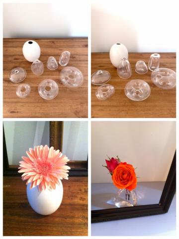 小さめサイズの花瓶8個セットです。ガラスの一輪挿しが7個と、白い卵型のベースが1つ入っています。ちょっとしたお花やグリーンを飾るのにちょうどいいサイズです。ドーナツのような形のガラスベースは、水に浮かべて飾ることもできて、少し雰囲気を変えて楽しめます◎いくつか並べて飾るとかわいいですし、それぞれ別々に使うこともできます。