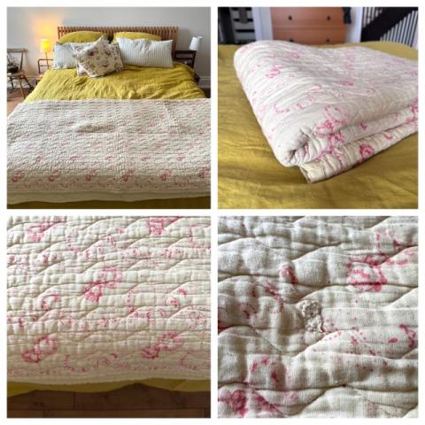 シャビーシックな雰囲気が素敵なローズ柄のキルトを、$75でお譲りします。新品にはない、くったりとしたやわらかい生地感が魅力の一枚です。 使い込まれることで生まれた風合いがあり、ナチュラルであたたかみのある空間づくりにぴったりです。