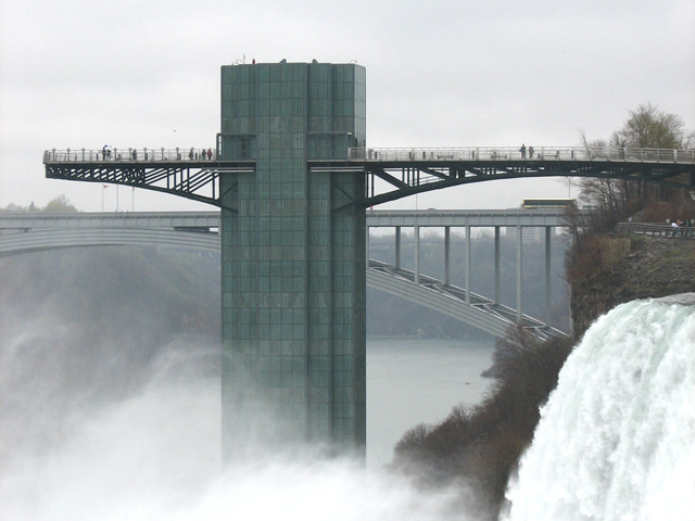 レインボー・ブリッジを渡って右手にある公園でアメリカ滝観光の出発地点で、アメリカ滝を間近に見下ろせます。また、ここにある展望タワーからは、カナダ滝、アメリカ滝、ブライダル・ベール滝の3つの滝を一望できます。尚、展望台のエレベーターで下がったところが、アメリカ側の霧の乙女号乗り場だ