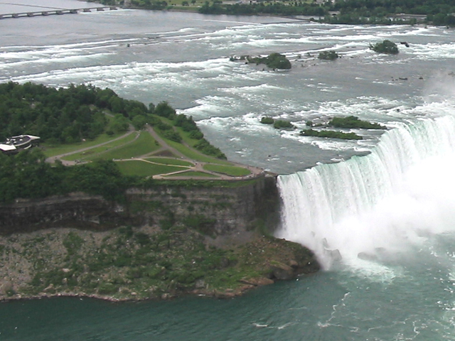 テラピン・ポイントは、カナダ滝とアメリカ滝の間にあるゴート島のカナダ滝側にある滝を間近で見られるビューポイントです。滝全体は眺められませんが、悠々と流れるナイアガラ川が滝口に吸い寄せられるように落ちていく様子がわかります。アメリカ側でカナダ滝の一番眺めのいい場所です。