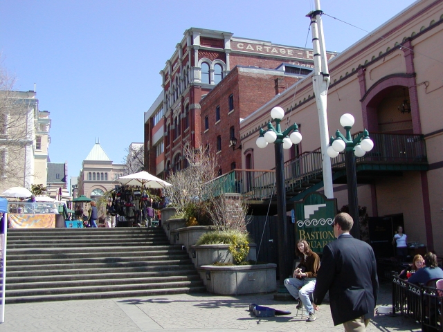 バスチョン・スクエアは、1840年代にジェームス・ダグラスによりビクトリア砦が築かれた場所で、現在、一帯の建物は改装され、ギャラリーやレストランが立ち並ぶおしゃれな一角となっています。広場の東には、BC州の航海の歴史を紹介する博物館、海洋博物館があります。